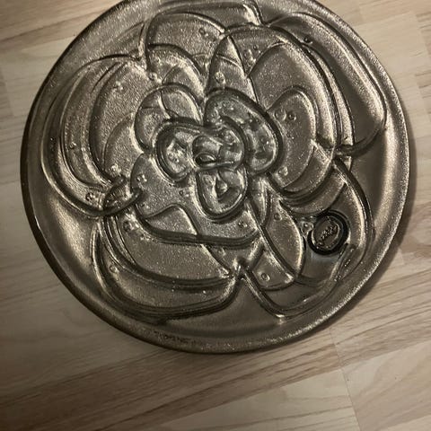 Glasfad, Rosenthal Jahresteller, 1975, Rosenthal Jahresteller in Glas. Edition ’75, Design Günther Uecker, Düssseldorf. 9. skulpturelle vægplatte i klart glas 1975. Syrestemplet ”Rosenthal Galerie Jahresteller in Glas 1975”. ”Uecker” signatur, 2208/3000. Diameter 36 cm. Originalkarton med brugs- og opbevaringsspor.