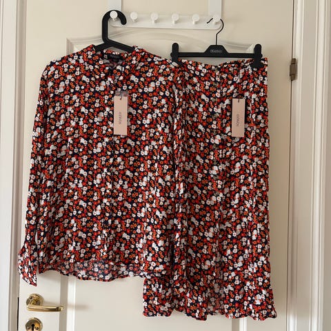 Andet, 2 biz, str. large, bronce og petrolium, Næsten som ny, Meget flot sæt i taft, silke og velour, med mange flotte detaljer. se billeder Bestående af nederdel, top og taljekort jakke. Top og jakke er også flot til sort nederdel eller bukser.