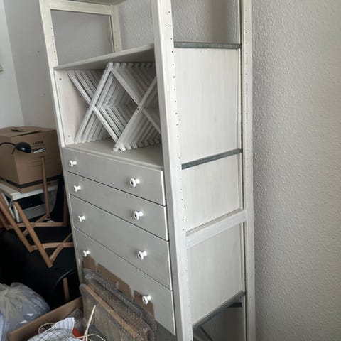 3 hylder foroven, 2 skuffer og 2 hylder bag skabslågerne