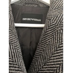 Frakke, str. 38, Emporio Armani , sort, hvid, grå fiskeben mønster, 48% bomuld + acryl, Næsten som ny, Vintage. Klassisk, taljeret, knælang Emporio Armani frakke til forår/ efterår str. italiensk 42, svarer til 38 med to skjulte stiklommer, samt 45 cm slids bagpå på.