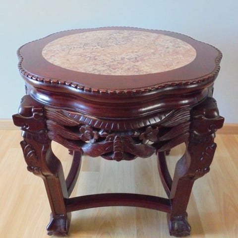 Kinesisk sidebord blomstermønster i pink marmor og træudskæring med mytisk fi...