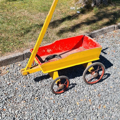 Trækvogn, I træ med hjul der ikke larmer, Micki, Vognen er brugt/ har et par skrammer men stadig velfungerende. En ny træk snor vil være fint.