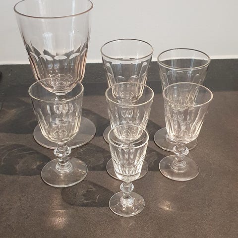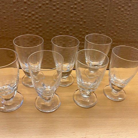 Glas, Hedvins- og snapseglas. Antikke oldemorglas, 19 i alt, 7 stk. hedvins- og 12 stk.snapseglas, som de har dem i Matador. De er hhv. 10 og 8,3 cm høje. De er ciselerede og nogle lidt uens i størrelsen fordi de er håndlavede. Alle i hel stand. Sælges helst samlet. MobilePay foretrækkes.