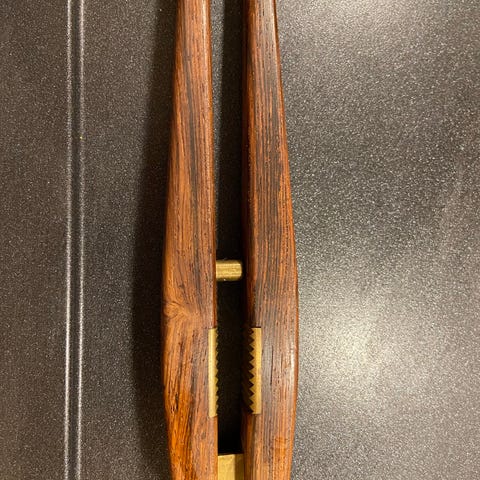 Stor nøddeknækker i teaktræ og messing.