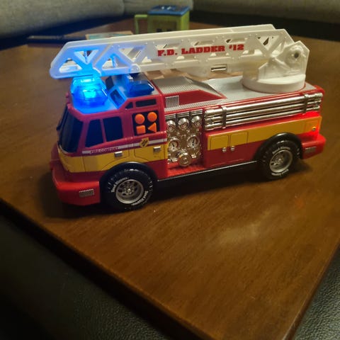 Brandbil, Trævarefabrikkerne, Fin legetøjs brandbil med gummihjul, der ikke larmer ret meget, når de kører. Kun brugt i få mdr og fremstår som ny.