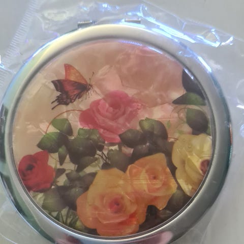 Spejl, Edita Piaff, Doppeltspejl til dametsken fra International Accessories Ø6,5 cm. Små skrammer fra opbevaringen.(1215)