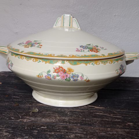 Fajance, Suppeterrin, Grindley, England, De smukkeste serveringsterriner, fade og skåle fra Grindley. Stellet hedder The Maple Leaf, har fantastiske farver og fremstår flot med ganske få brugsspor. En revne, som ikke er gennemgående er vist på billede.