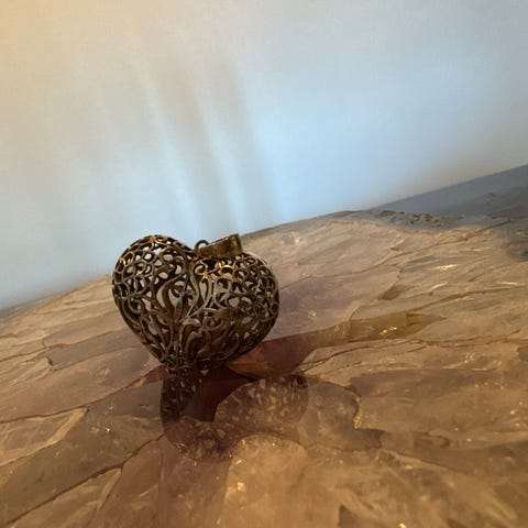 Smuk med hjerteformet clips på bagsiden. Måske messing.
