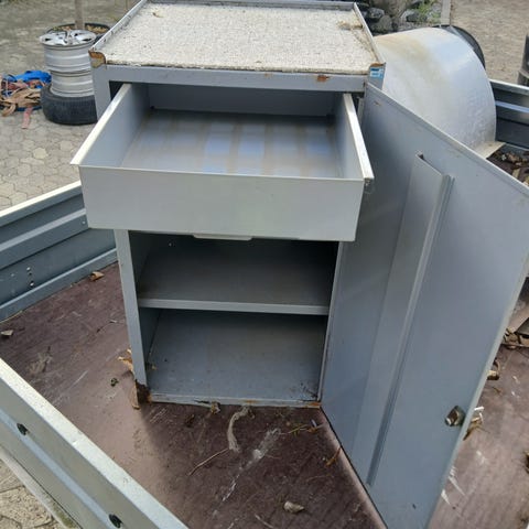 Værkstedsskab fra 1960erne, Stål, Værkstedsskab af stål fra 1960´ernes bilværksted i provinsen. Netop nedsat til 1500 kroner! Totalt retro, masser af patina, og perfekt til den rustikke indretning, som eksempelvis barskab. Mål: højde: 86 cm, B 50 cm., og dybde ca. 51 cm. Bemærk, at vi har to skabe fra samme sted, som sælges enkeltvis - men kan stå godt sammen i boligen!