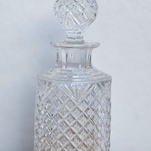 Flasker, Glaskaraffel, gammel, med tin og prop, Gammel glaskaraffel med tinkrave og prop.