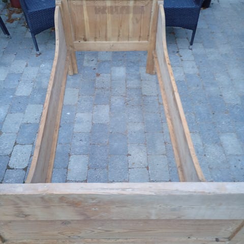 Enkeltseng, b: 94 l: 197 h: 124, Afsyret karlekammerseng, fyrretræ, fin stand, gammel. h, hovedende 124, gavl h 106, l 107/201, b 94.