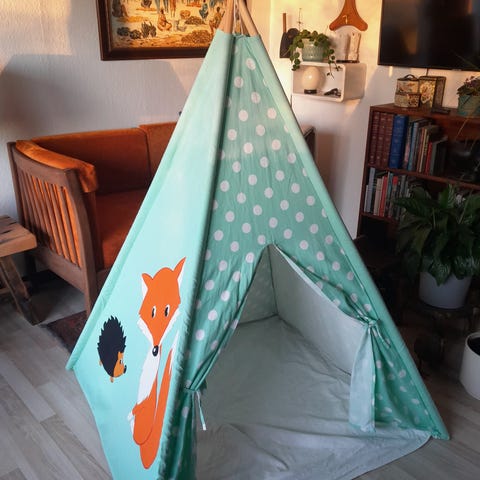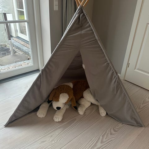Andet legetøj, Telt / tipi til hjørne og tilpasset til skråvæg. Super flot og pladsbesparende, da den udnytter hjørnet perfekt. Man kan trække stoffet lidt i toppen og surre det fast i en øsken eller skrue det skrues i væggen, så det kan tilpasses de hjørner og skrå vægge man måtte have. Så hyggeligt med et lille privat legehjørne. Tipien er i en lys grå farve, tilpasset og personaliseret med smukke detaljer, gardiner i “pels” blomster, indianerinspirerede motiver mm.