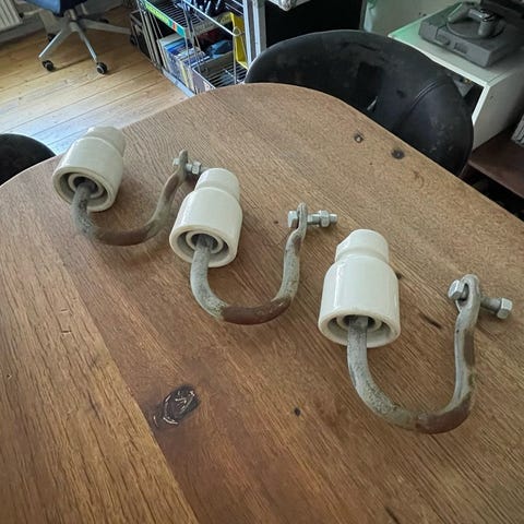 Knager, Porcelæn / metal, Disse gamle porcelæns isolator klokker fra gamle telefon pæle kun bruges til en ting.