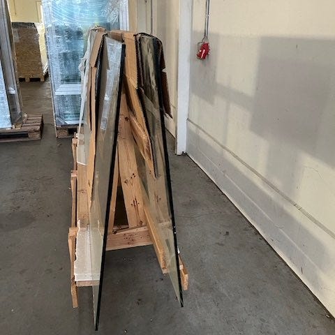 Andet, 1 lags, 10 mm glas 1 stk 54 x 207 cm med slebne og fasede kanter. Har været brugt som disk i optikerbutik er derfor ikke fri for ridser.