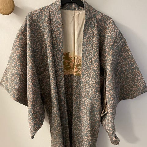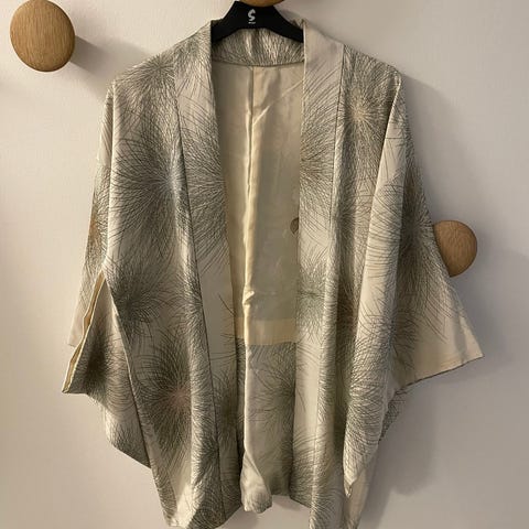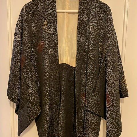 Kimono, Vintage, str. Xxl, Sort med b, Silke, God men brugt, Vintage kimono i silke med smukke blomster i guld, rød og sølv. Kan bruges op til str xl/xxl og kan bruges som jakke over kjolen eller til et par bukser
