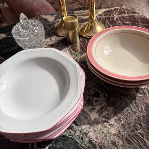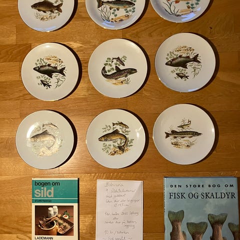 Sildetallerkener hvor fiskedekorationen fylder lidt mere på tallerkenen. Syv stk med seks forskellige motiver. Der er to af hver af den i midten og den øverst til højre. En enkelt er lidt slidt på guldkanten. Ellers er alle i fin stand og uden brugsspor. Ø20 cm. Du kan loppesjoppe dem samlet for 160 kr.