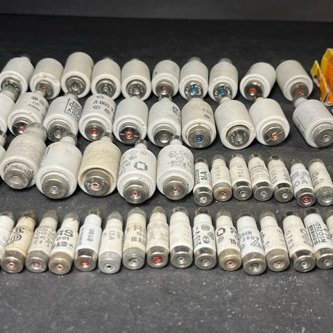 Sikringsgruppe til store 16 A sikringer, Brugt. Der kan forekomme snavs, malingrester og mindre skader og mangler på dem.