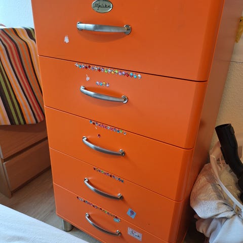 kommode, Colorit, Fin lille kommode købt med patina look og har nok fået lidt ekstra patina gennem årene da det senest har stået på prinsesse værelset.