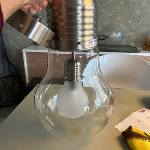 Lavet i glas og metal. 220watt. Med kæde og ledning.