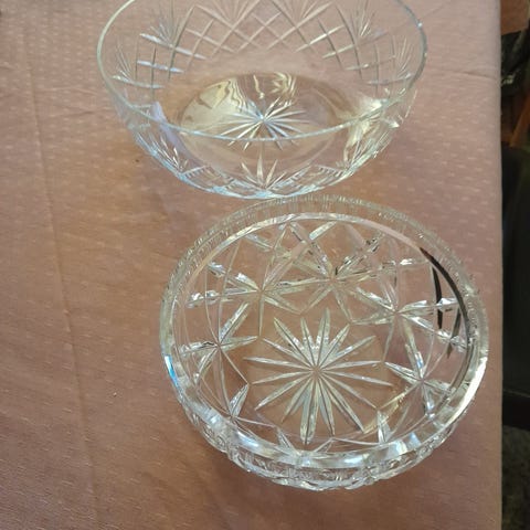 Glas, Skåle, 4 krystalskåle. Højde 6 cm. Diam.12,5cm. Incl. hæklede mellemlags servietter.