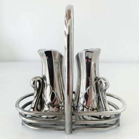 Søgeord: Sølv, Pletsølv, Metal, Platemenage, Platmenage, Salt & Pebersæt, Retro, Antik