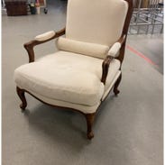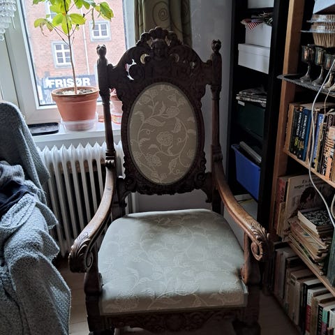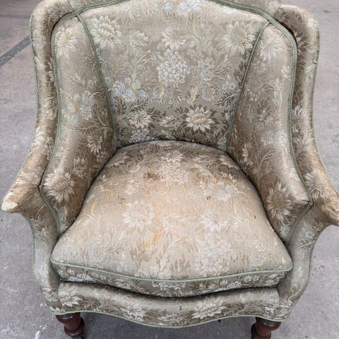 Lænestol, andet, 2 lænestole i mahogni, med “armygrønt” stof og guldkant. Rokoko stil med fine udskæringer.