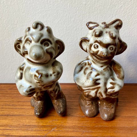Krølle Bølle, Keramik, 40 år gl., 4 stk. troldefigurer af Michael Andersen, Bornholm. Uden skår. 1 pige: 7 cm. De 3 andre: 9 cm. Sælges samlet for 200 kr.