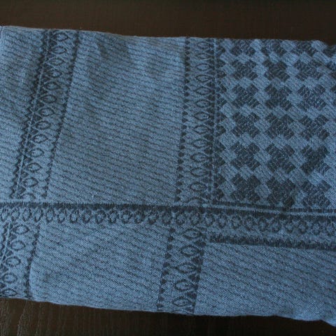 Blå tørklæde. Dette tørklæde har et unikt mønster og er lavet i en behagelig blå nuance. Ideel til daglig brug eller som en stilfuld tilføjelse til din garderobe.