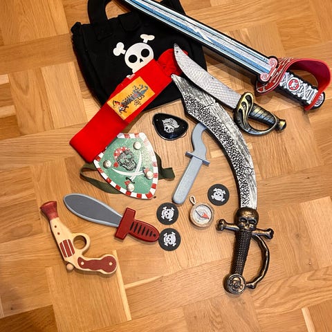Sørøver, Sørøver, Ukendt To stk Sørøver til drengeværelset med guldmønter og svær -en finger er faldet af. for dem To stykker med kranie og guldmønter prisen Papegøje og svær / kniv - Fine at have på drengeværelset giv et bud.