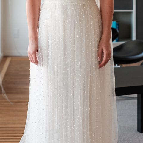 Billederne er fra 12.11.22. Kjolen passer en str. 36. Jeg er 161 cm høj og bar 12,5 cm plateau-hæle til mit bryllup.