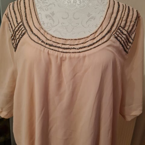 Tunika, model ZIZZI, str. XL, Beige, rød, guld, sølv, Chiffon, Næsten som ny, Fint mønster, se billeder. Med bindebånd foran i udskæring. Små sølv "klokker" for enden af bindebånd.