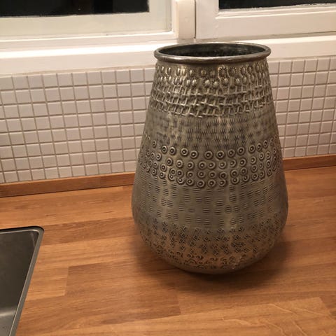 Vase i metal, Vase i metal, 25 cm høj. Kan også bruges til at have remedier i eller andet.