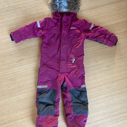 Flyverdragt, Flyverdragt , Didriksons, str. 116, Str. 120, brugt og har en pålimet lap på knæet efter et hul, som har løsnet sig i kanten. Slid på reflekserne forneden.