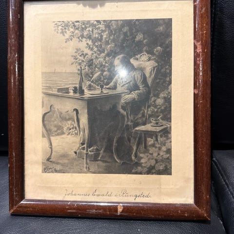 Tryk, motiv: Portræt, b: 28 h: 33, Tryk af Johannes Ewald i glas og guldramme som måler 28 x 33 cm