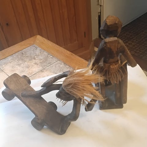 Små træfigurer, Par.i træ- sjove figurer - muligvis svenske med hår i gult garn, Der er rester af label og nummer i bunden men ikke nok til at identificerer dem. Samlet pris kr 35
