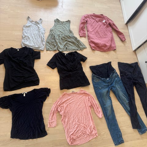 Kjoler, bukser, skjorter, t-shirts , str. 44, Næsten som ny, Graviditetstøj - tshirt, trøje, skjorte (med mærke på), 2 par bukser, 2 kjoler som er også ammekjoler. Ventetøj, ammetøj. Størrelse L og XL.