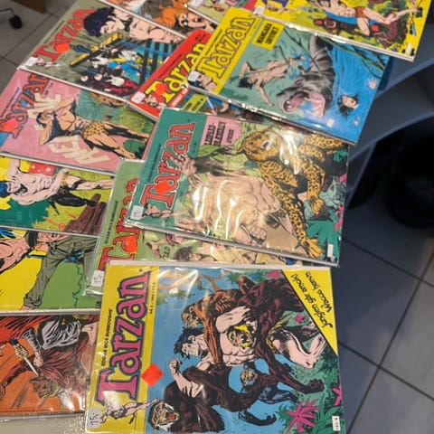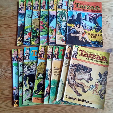 Tarzan tegneserieblad med farverig illustration på forsiden. Indeholder actionfyldt historie med karakterer i kamp. Velegnet til samlere og tegneserieentusiaster.