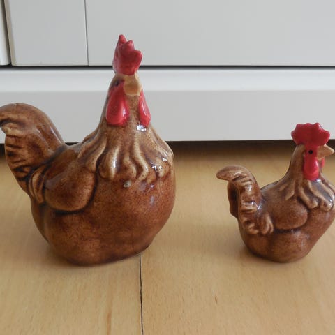 Porcelæns hane og kylling magnet . Hanepane og kyl, Hanepane og kyllerylle .. En porcelænshane og en håndlavet kyllingemagnet .
