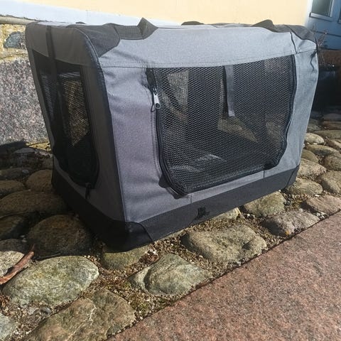 Har denne let brugte hunde taske/bur hvor der er god plads. Der er en lækker måtte som er blød i bunden - der er gardiner der kan rulles ned så det bliver mørkt i buret.