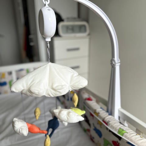 En uro til tremmeseng fra Fischer Price, som roterer og afspiller kendt børnemusik og lys i flere niveauer. Fjernbetjening medfølger.