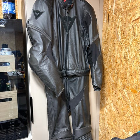 BMW Atlantis motorcykeldragt i sort læder, størrelse 54. Dragten består af jakke og bukser med beskyttende detaljer. Designet til motorcykelbrug med fokus på komfort og sikkerhed.