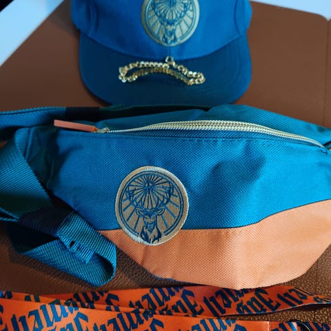 Bakke, 12 store, 3 små glas til fryseren, 5 hatte, halskæde, div. Flag ølbrikker osv.