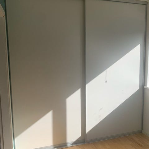 Skabslåge, Kvik, b: 90 d: 4 h: 231, 2 stk helt nye Kvik skydedøre, model smart alu 310, 1 stk White Wood og 1 stk i Silver mirror “spejl”.