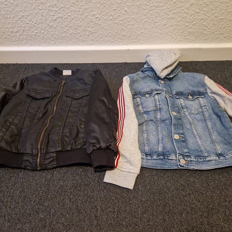 str. 110, Str. 5 år. Camouflage. Blå/Sort. Slidt. God som ekstra jakke. Se billeder
