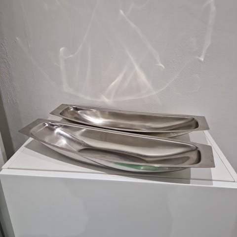 Rustfrit stål, Tre fade og sukkerskål/flødekande, Lundtofte, 3 fade det ene med teaktræ målene er 31x22 og 52x25 cm