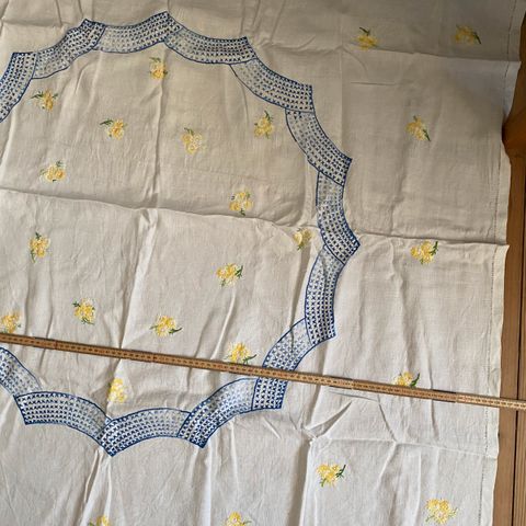 Retro dug med broderi, Broderi, Kridhvid retro dug med vævning og mini hulmønster plus 16 stk små broderier i forskellig farve, 4 i hvert hjørne.