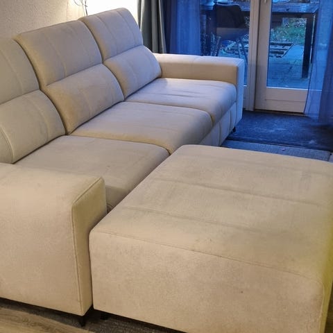 Sofa, Stor sofa sælges i rigtig fin stand og uden pletter. . Fra Hebru i Haderslev. Der er special stærk skum i puderne så den er mere slidstærk og blir ik flad at se på.. Er 345 på den lange led. Den kræver plads og den er tung. Deles i 3. Der medfølger en puf til sofaen så du kan gøre den større både som sofa og som en sengeplads til 2 ekstra. Nypris 17500 kr