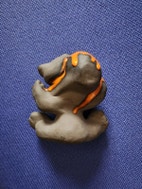 Keramik, DAM TROLDEDRENG, Han har en hat på ryggen - der løber rød / orange glasur ned over ham.