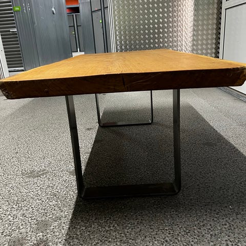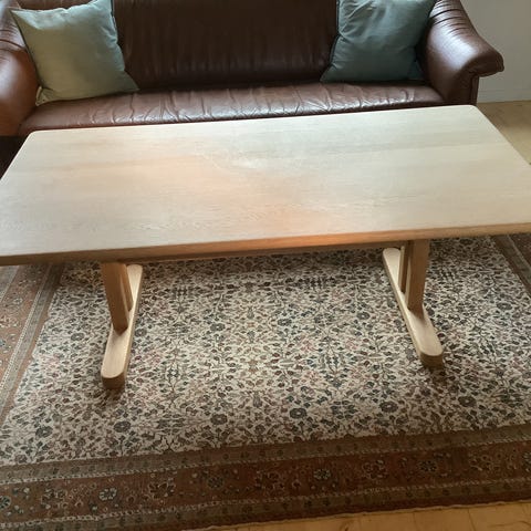 Sofabord, massiv egetræ, b: 90 l: 90 h: 43, Sæbebehandlet egetræplade 4 cm tyk, med stålunderstel.