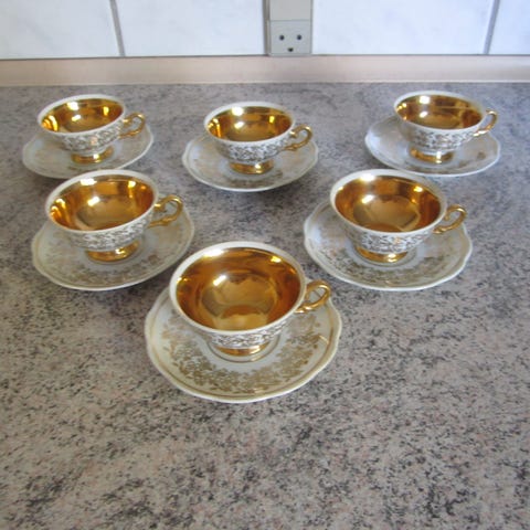 Porcelæn, smukke, ægte retro mokkakopper, Aristo Copenhagen, Ægte retro 12 kopper m underkop inkl tre små "underkoplignende" ting - måske kuvert-askebægre(?) Meget fin stand men de er selvfølgelig af ældre dato med en smule slitage på guldkanten nogen steder - men de er også fra 1950-1960erne.